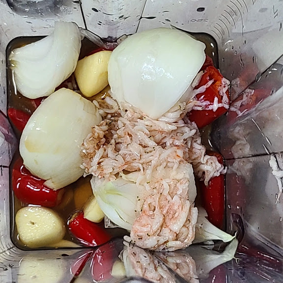 양파 1/2, 마늘 5, 새우 젓갈 3큰술, 홍고추 3, 매실액 2큰술 넣어서 믹서기로 갈아줘요