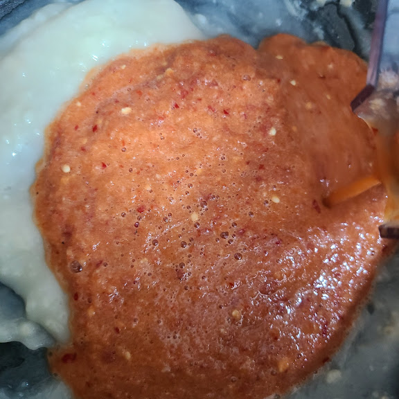 고춧가루 5큰술, 멸치젓갈 3큰술, 풀물 1컵