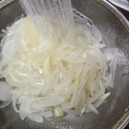 데친 양파를 찬물에 헹궈서 물기를 제거해 줍니다.