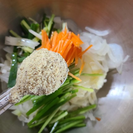 양념재료 들기름 1작은술, 깨소금 1작은술, 들깻가루 1작은술, 소금 약간 넣어줍니다.