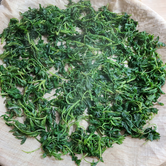 찐 쑥의 수분이 제거 되도록 5시간 정도 말려 줍니다.
