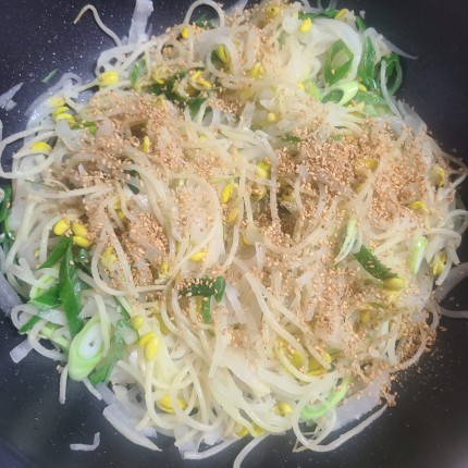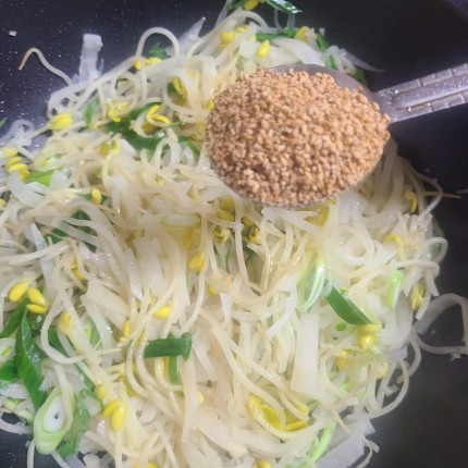 참기름 1큰술 깨소금 1큰술 넣어서 무콩나물 볶음 만들기 마무리합니다.