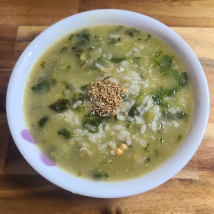 모든 재료가 잘 섞여 죽이 되면 불을 끄고 따끈하게 담아 먹습니다.