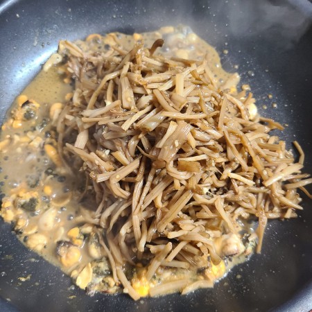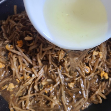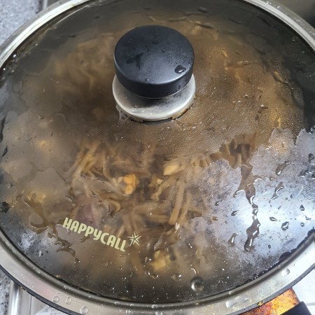육수 (멸치 버섯 다시마) 1/2컵 붓고 뚜껑 덮어 2분쯤 익혀줍니다.