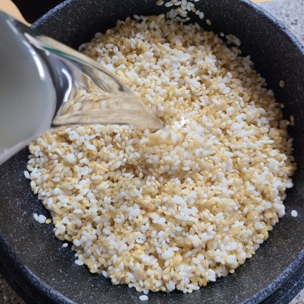 솥에 불린 쌀, 다시마 우린 물 500ml 물을 잡아줍니다.