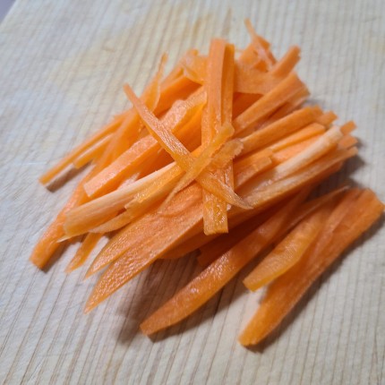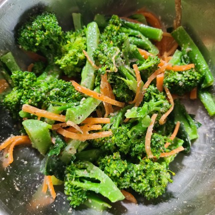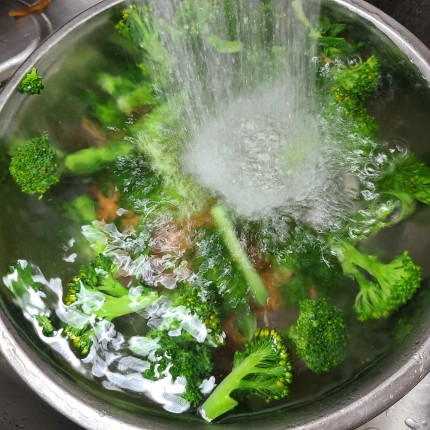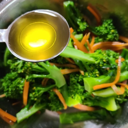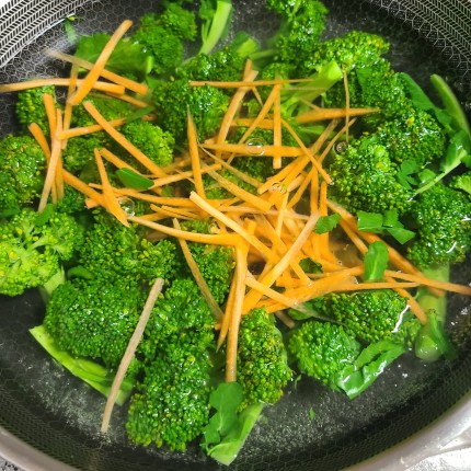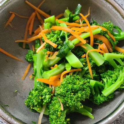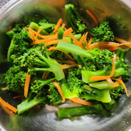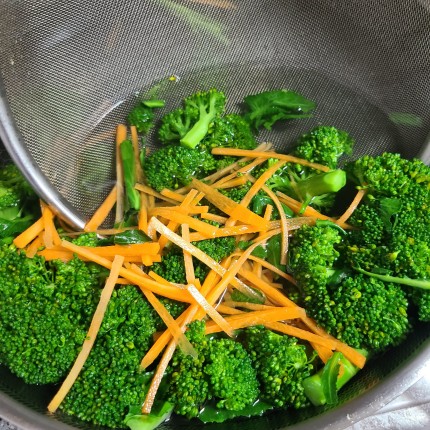 데친 브로콜리 당근 찬물에 헹궈서 물기를 제거합니다.