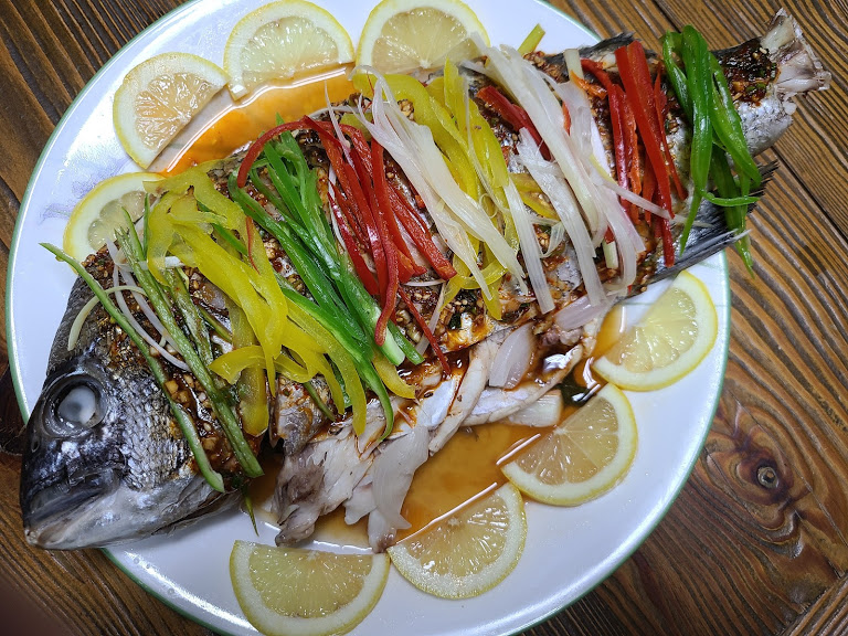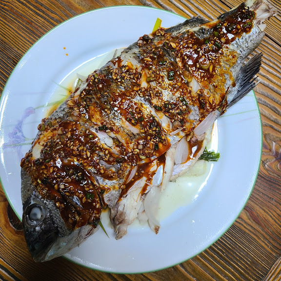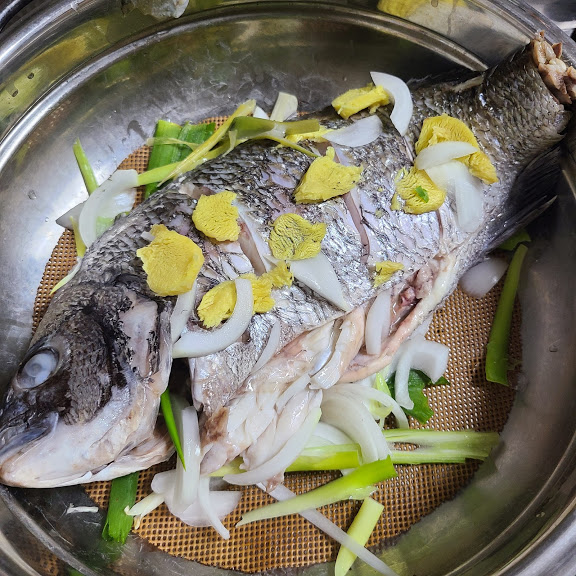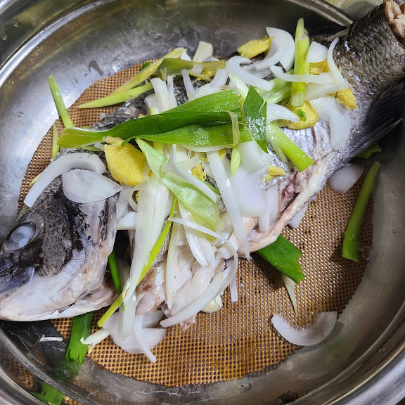 감성돔 찐 후에는 양념장을 위에 솔솔 올려 주면 됩니다