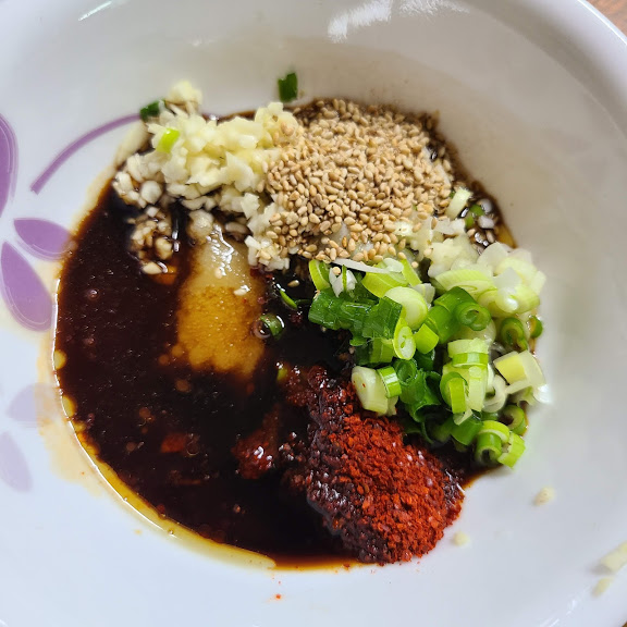 (다진마늘 1큰술, 간장 4큰술, 고춧가루 1/2큰술, 올리고당 1큰술, 깨소금 1큰술, 설탕 1큰술, 다진파 1큰술, 참기름 1/2큰술)