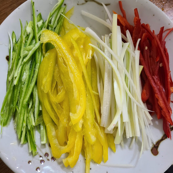홍고추 파프리카 파 청고추 잘게 채 썰어 고명으로 준비합니다