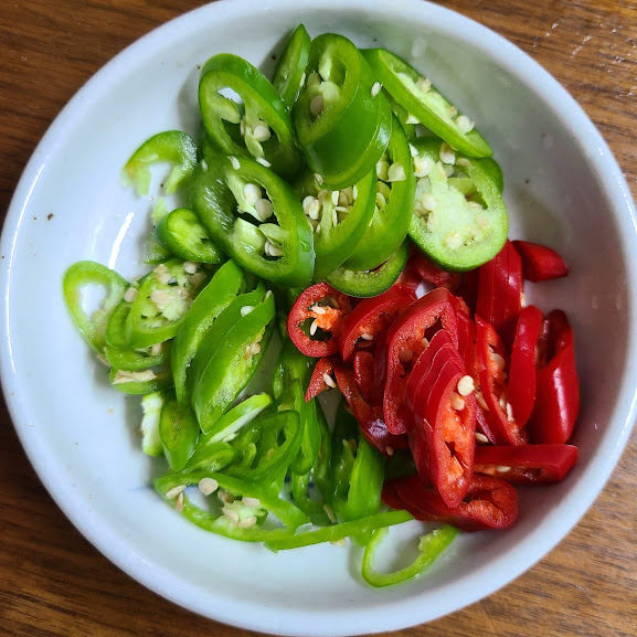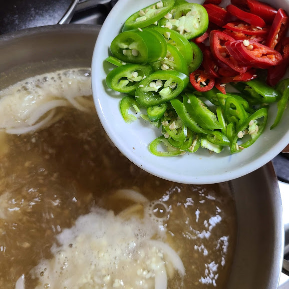 양파 채 썰고 고추들 총총 썰어서 준비합니다