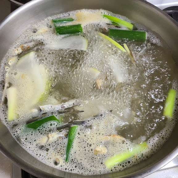 육수 재료(멸치 무 다시마 파) 넣고 끓여 준비합니다