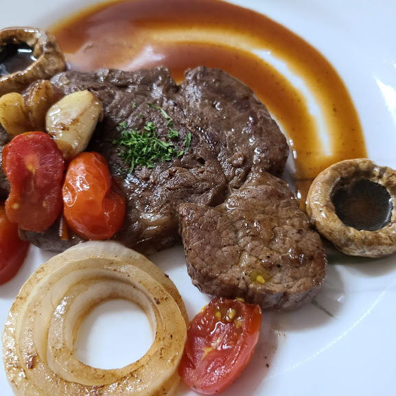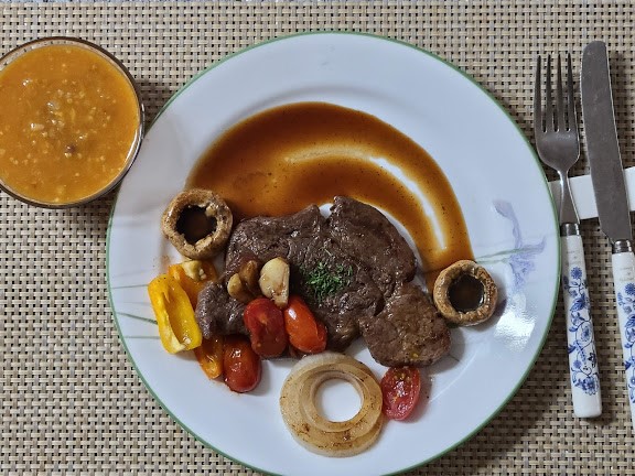 스테이크 고기 2, 양송이버섯, 파프리카, 방울토마토, 양파, 마늘