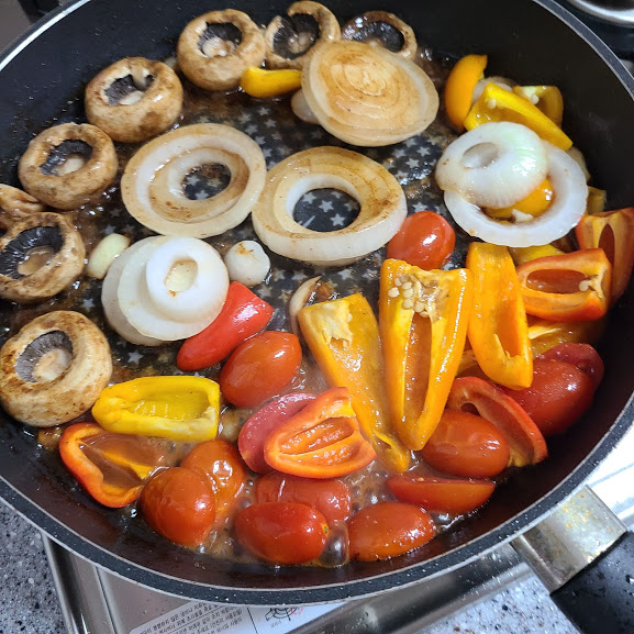 버섯, 파프리카, 양파, 마늘로 곁들일 수 있는 구성