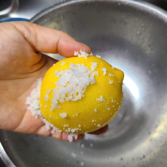 레몬을 소금으로 박박 문질러 씻어 줍니다.