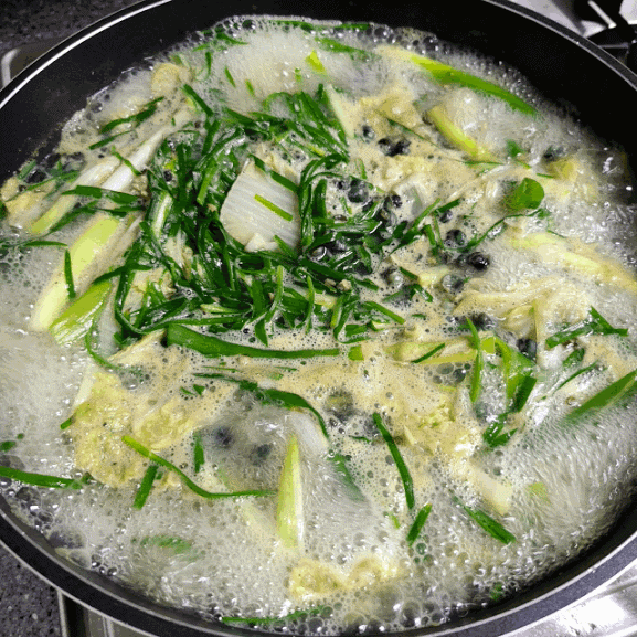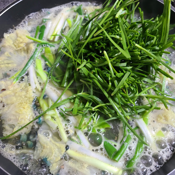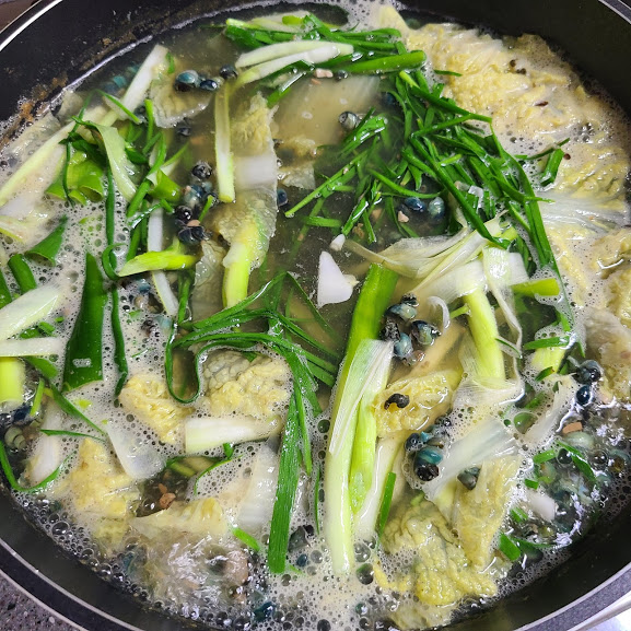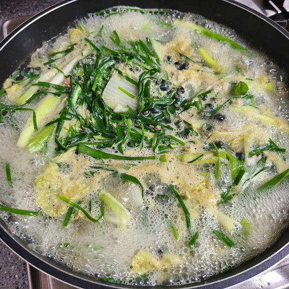 다슬기 200g, 알배추 조금, 된장 1.5큰술, 파 3, 부추 한줌, 다진마늘 1큰술, 육수 2L