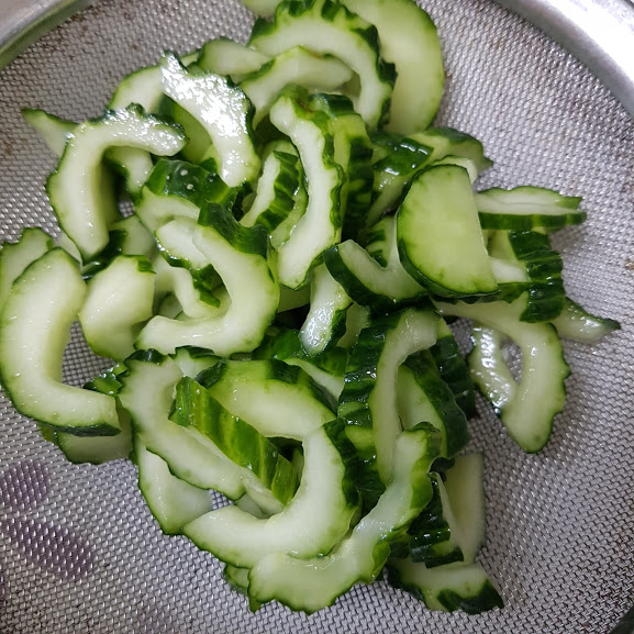 절인 오이는 채에 걸러주고, 치킨 타월로 물기를 제거합니다.