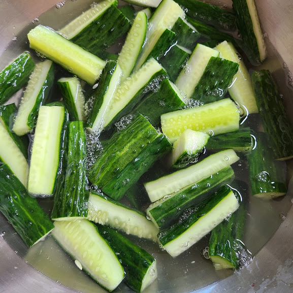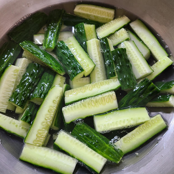 뜨끈한 물에 절여 주면 오이가 아삭 거려요