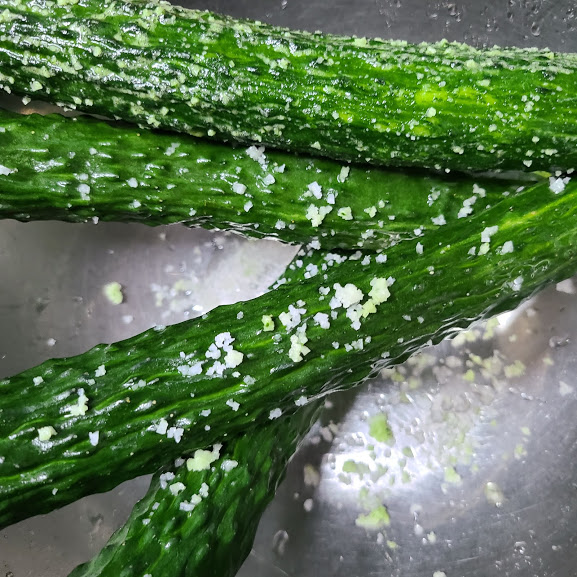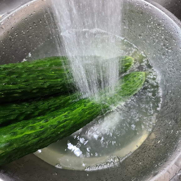 오이 4개 소금으로 빡빡 문질러서 깨끗이 헹구어 줍니다.