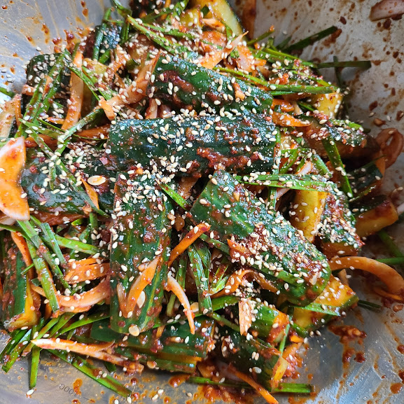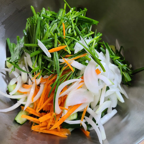 오이 4, 부추 한줌, 양파 1, 당근 1/3, 소금 4큰술
