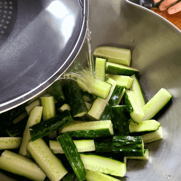절여진 오이는 찬물에 헹구어 물기를 제거해 줍니다