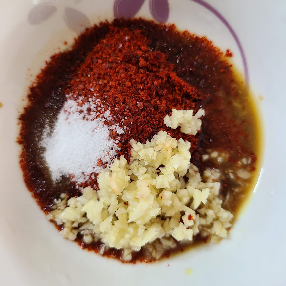 (멸치액젓 1큰술, 고춧가루 4큰술, 다진마늘 1큰술, 새우젓 1큰술, 매실청 3큰술, 설탕 1작은술, 생강즙 1작은술)