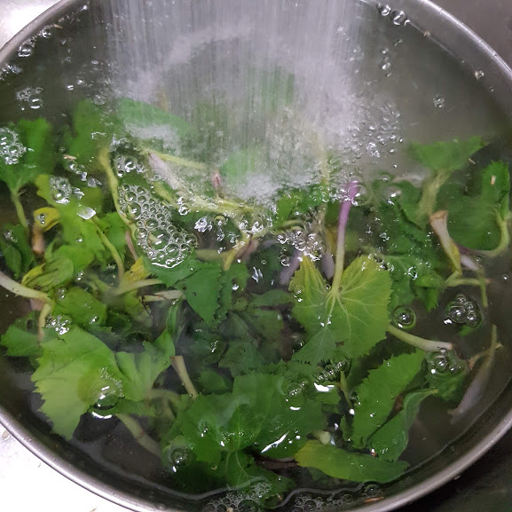 어린 머위 다듬어 씻어 줍니다
