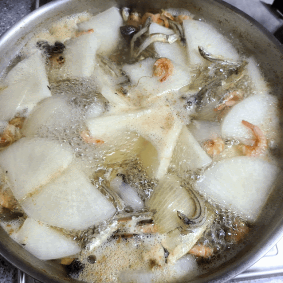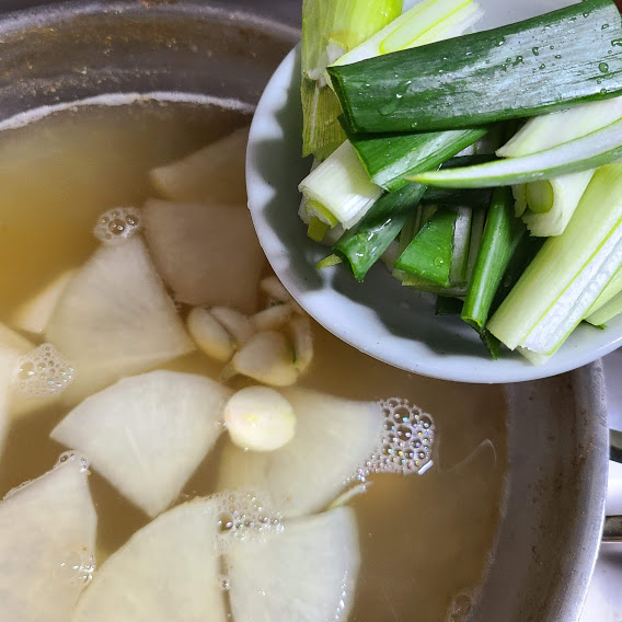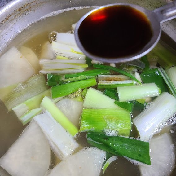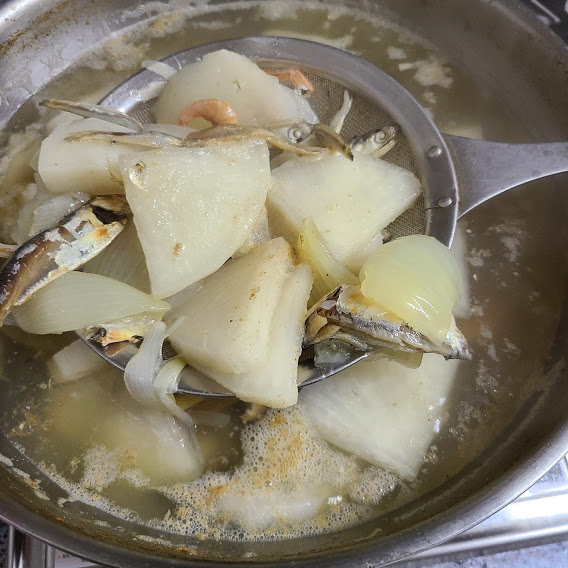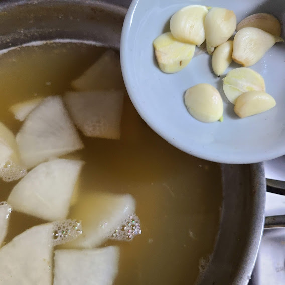 끓인 육수에 건더기 중에 무만 다시 넣고