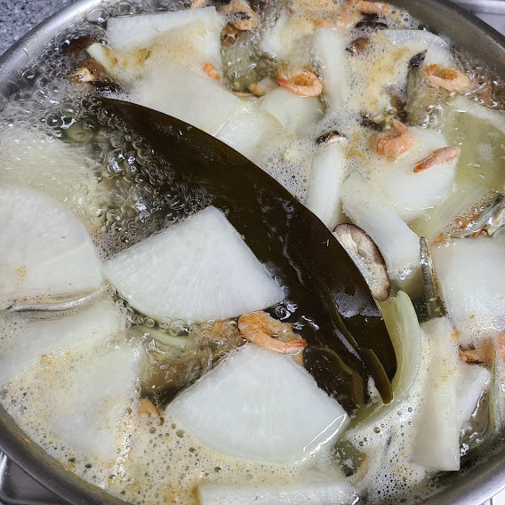 (멸치 한줌, 디포리 7, 다시마 1장, 건새우 한줌, 버섯 6, 무 1/3, 양파 1/4(조금), 물 3L)