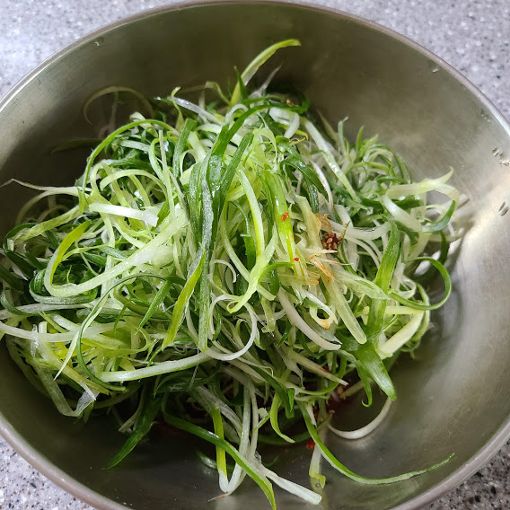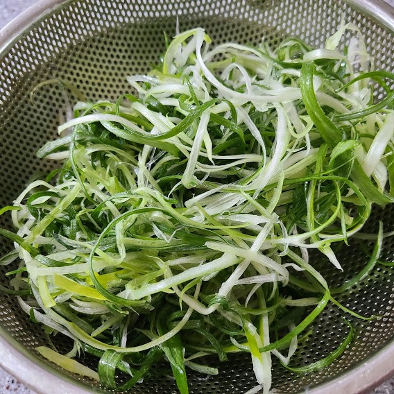 썬 파를 10분 이상 담가 두어서 매운맛을 내는 성분을 빼내 줍니다.