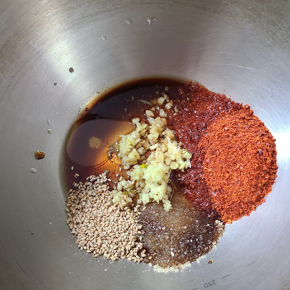 (설탕 1큰술, 매실액 1/2큰술, 고추가루 3큰술, 진간장 3큰술, 다진마늘 1큰술, 참기름 1/2큰술, 식초 2큰술, 통깨 조금)