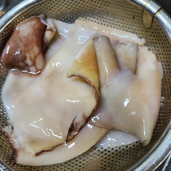 데친 오징어는 찬물에 헹구어 줍니다