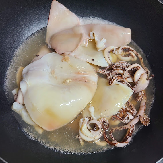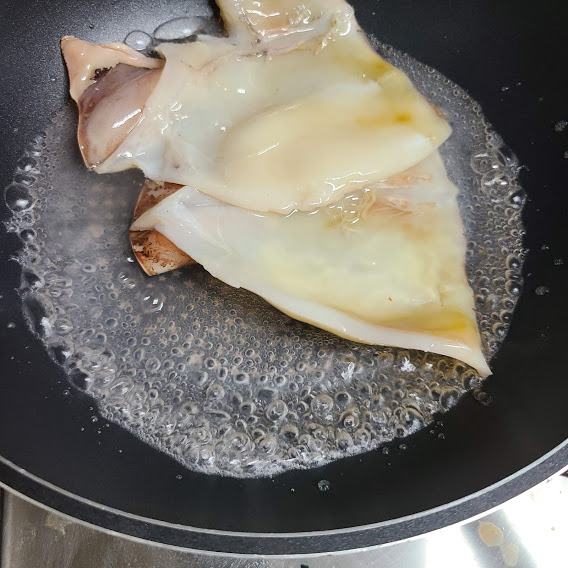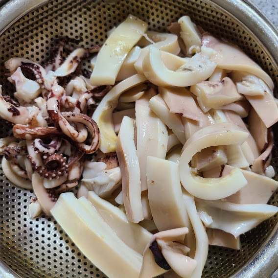 오징어는 끓는 물에 1분정도 데쳐줍니다.