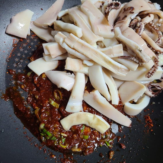준비한 오징어 넣고 골고루 섞어 볶아줍니다
