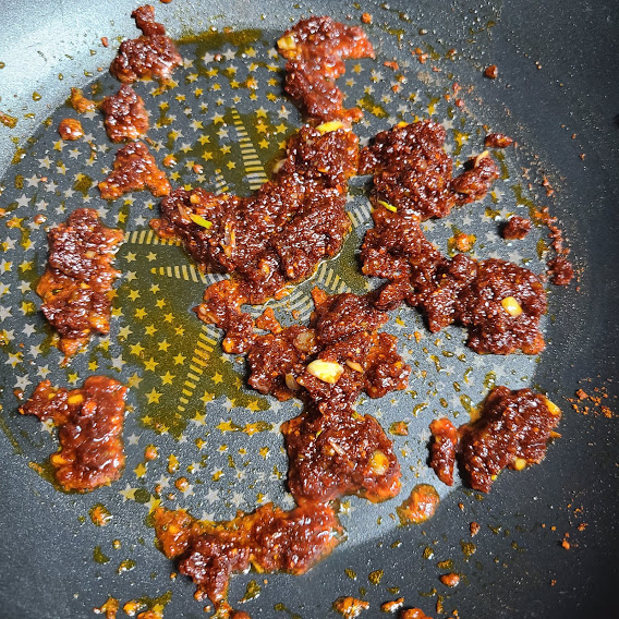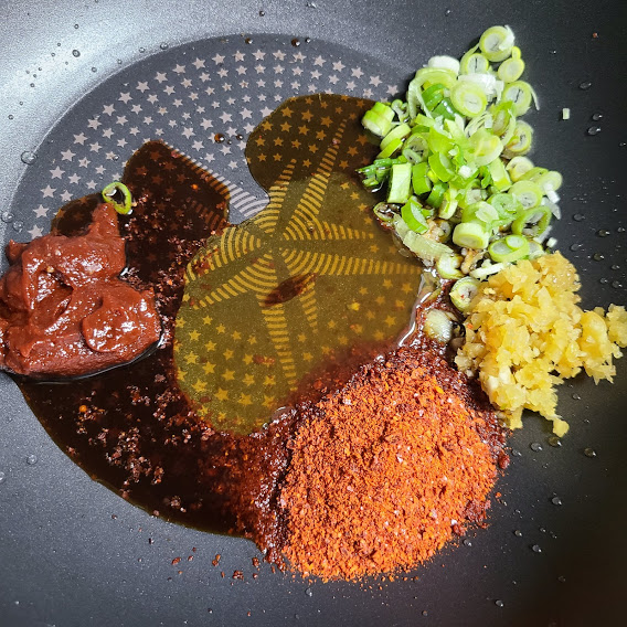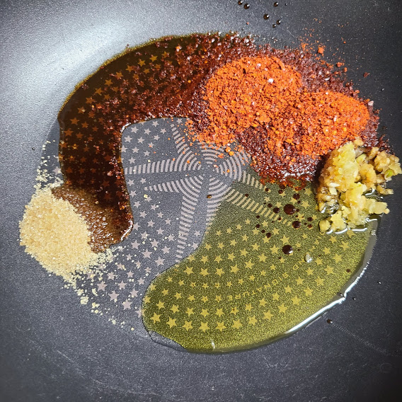 팬에 올리브 오일 2큰술, 다진마늘 1작은술, 고춧가루 2큰술, 간장 2큰술, 설탕 1작은술 넣고