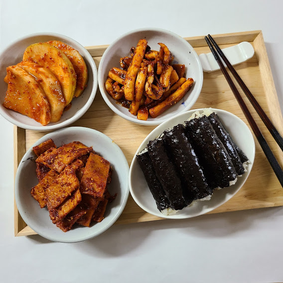 김, 밥, 어묵 볶음, 오징어 볶음, 석박지, 참기름, 깨소금, 소금