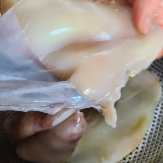 껍질제거는 굵은 소금을 손에 잡고 껍질 부분을 꼭 잡고 당기면 됩니다.