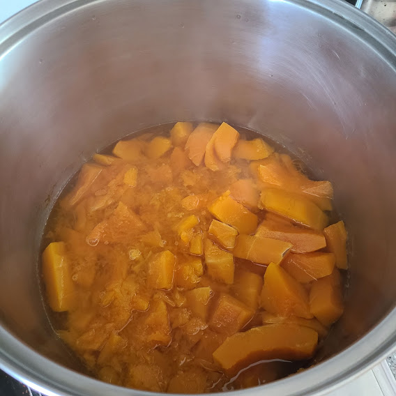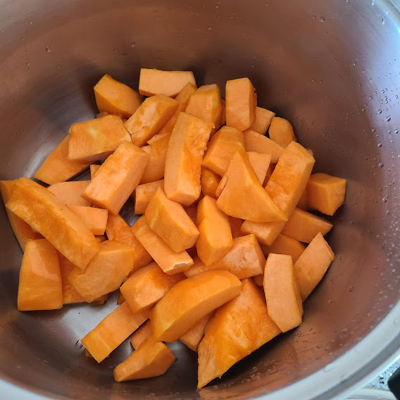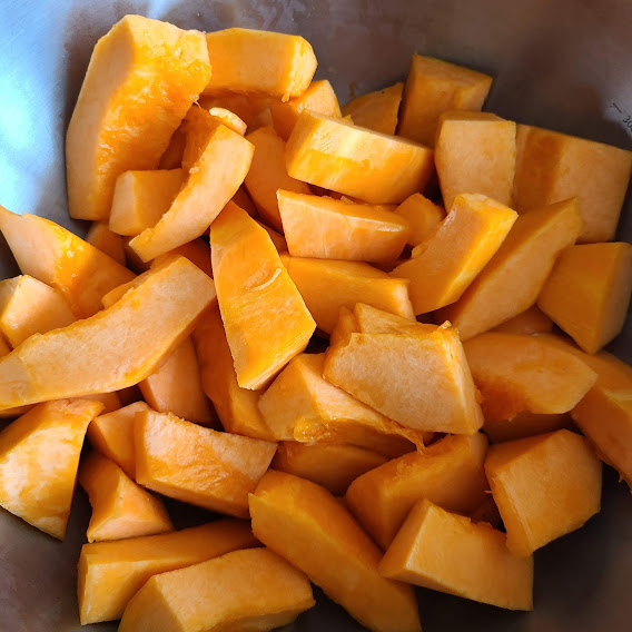 껍질 제거한 호박을 적당하게 썰어줍니다.