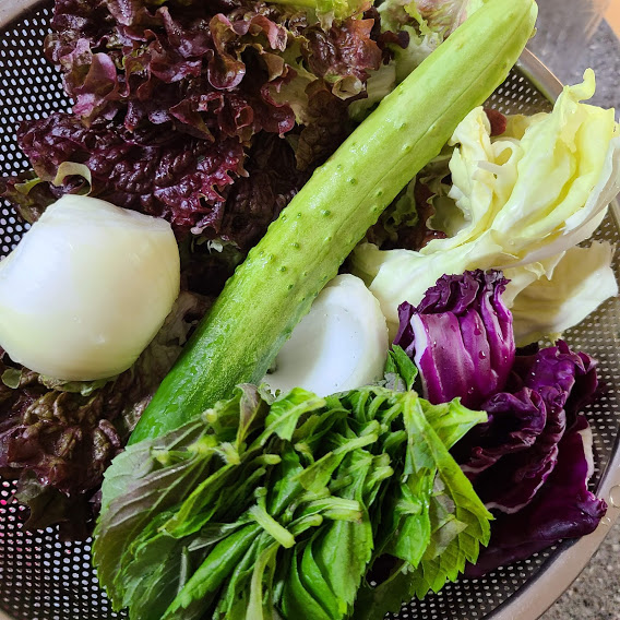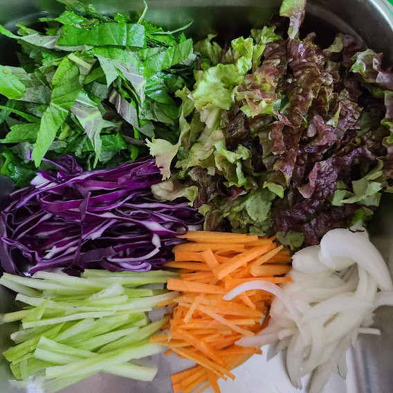 양파, 상추, 자색 양배추, 당근, 오이, 깻잎, 양배추, 밥, 초고추장