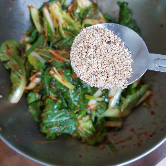 추가로 준비된 야채(파, 부추, 당근)를 넣고 깨소금 1큰술 넣어서 골고루 섞어 마무리합니다.