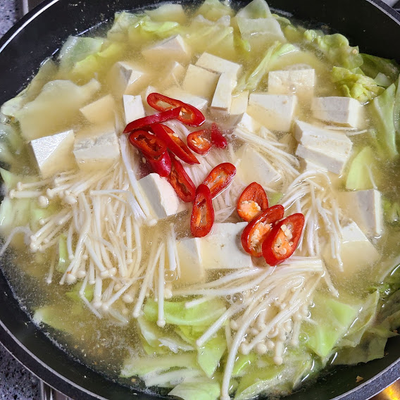 끓어오르면 팽이버섯, 두부, 홍고추 넣어줍니다.
