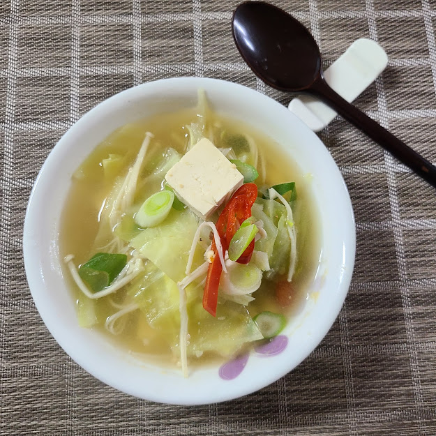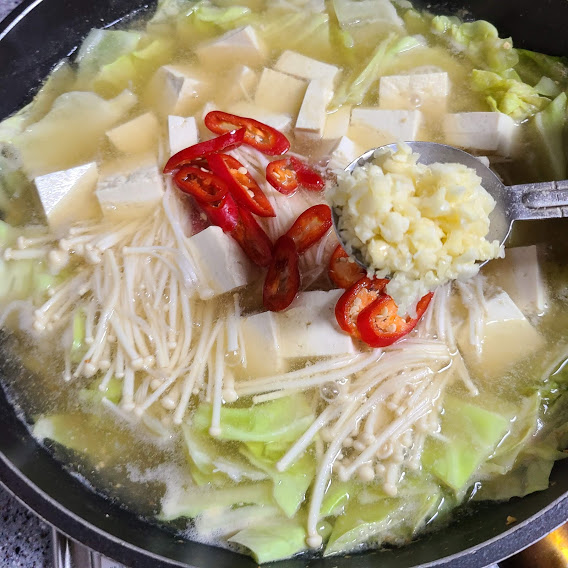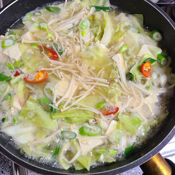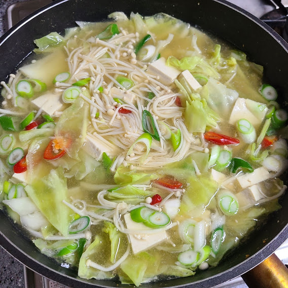 양배추 5장, 두부 1/4, 팽이버섯 1