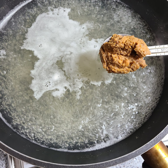 끓인 육수에 된장 1큰술 풀어줍니다.