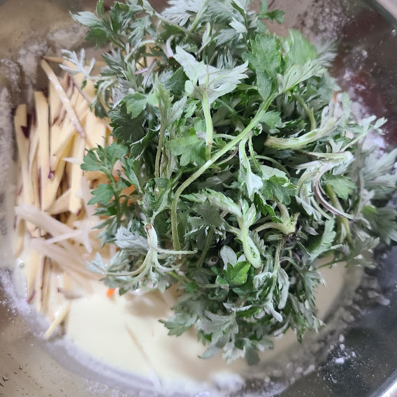 야채튀김에 쑥을 넣어 튀겨보세요.