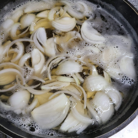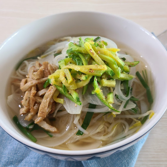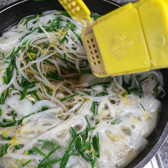 국수 3인분, 숙주 두 줌, 양파 1, 부추 한 줌, 진간장 1큰술, 국간장 1큰술, 육수
