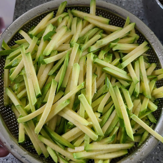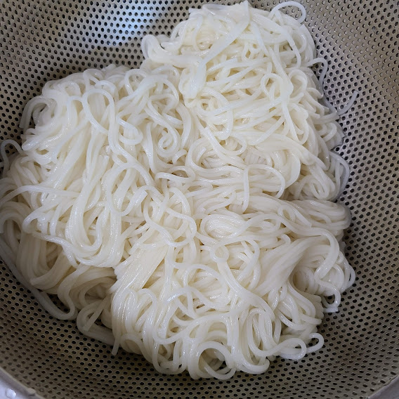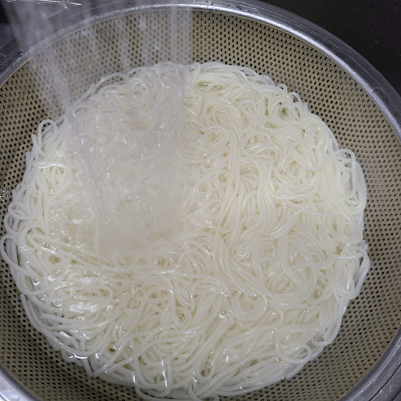 헹굴 때 국수의 전분이 빠지도록 바락바락 문질러 줍니다.