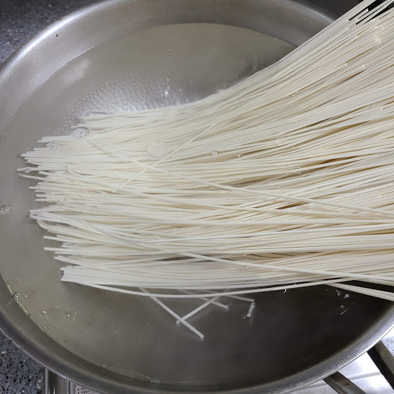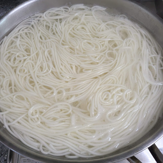 끓는 물에 식용유 1큰술 넣고 국수를 삶아줍니다.