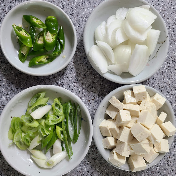 두부 1/2, 양파 1, 파 1, 청양고추 2, 썰어서 준비합니다.