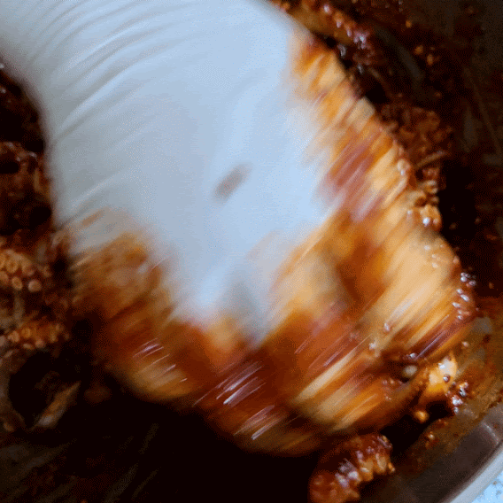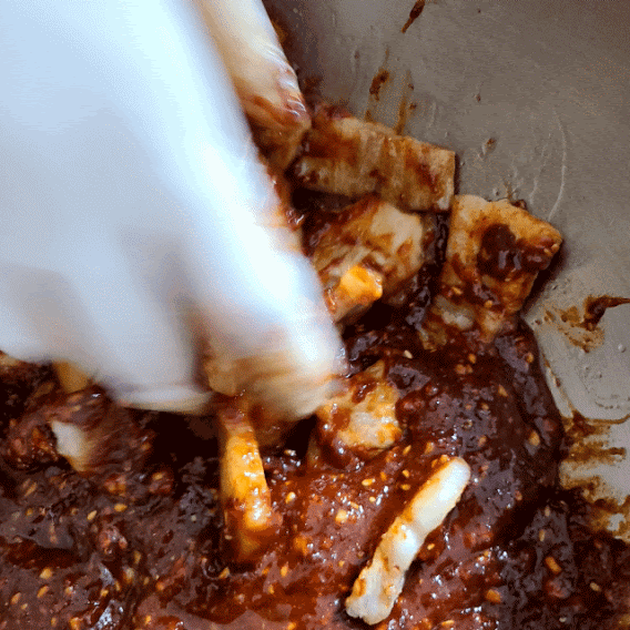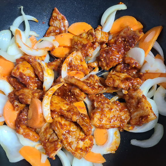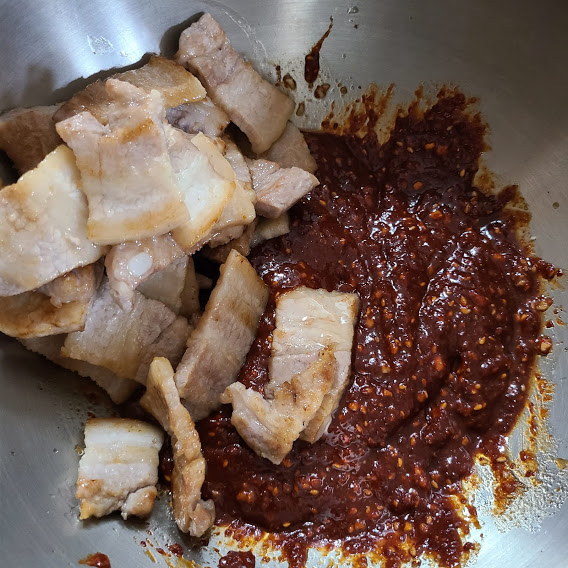 초벌 구워준 돼지고기 양념장에 버무려 줍니다.