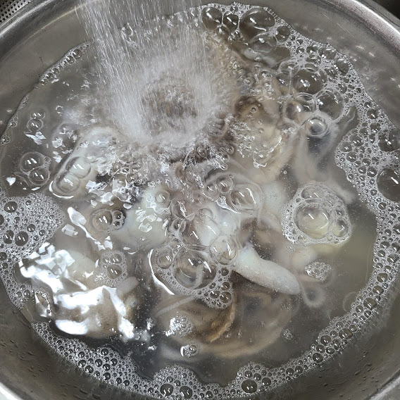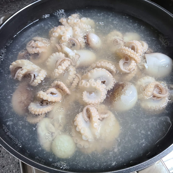 주꾸미는 끓는 물에 1분 정도 삶아 데쳐 줍니다