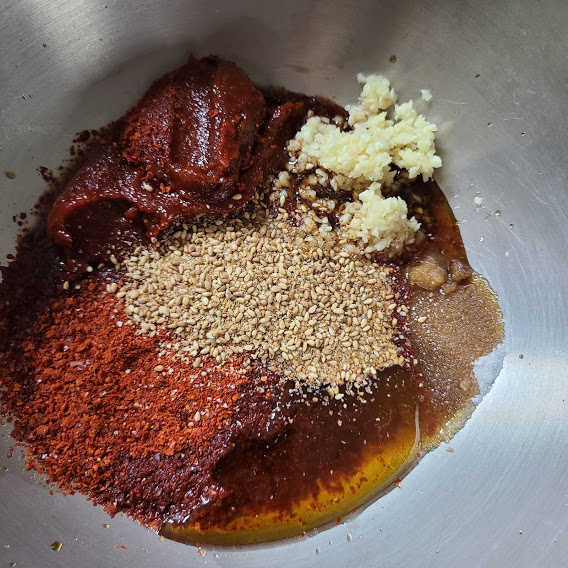(양념장 재료 : 고추장 1.5큰술, 고춧가루 1.5큰술, 간장 2큰술, 설탕 1큰술, 다진마늘 1큰술, 참기름 1큰술, 후추 조금, 깨소금 1큰술, 맛술 1큰술)